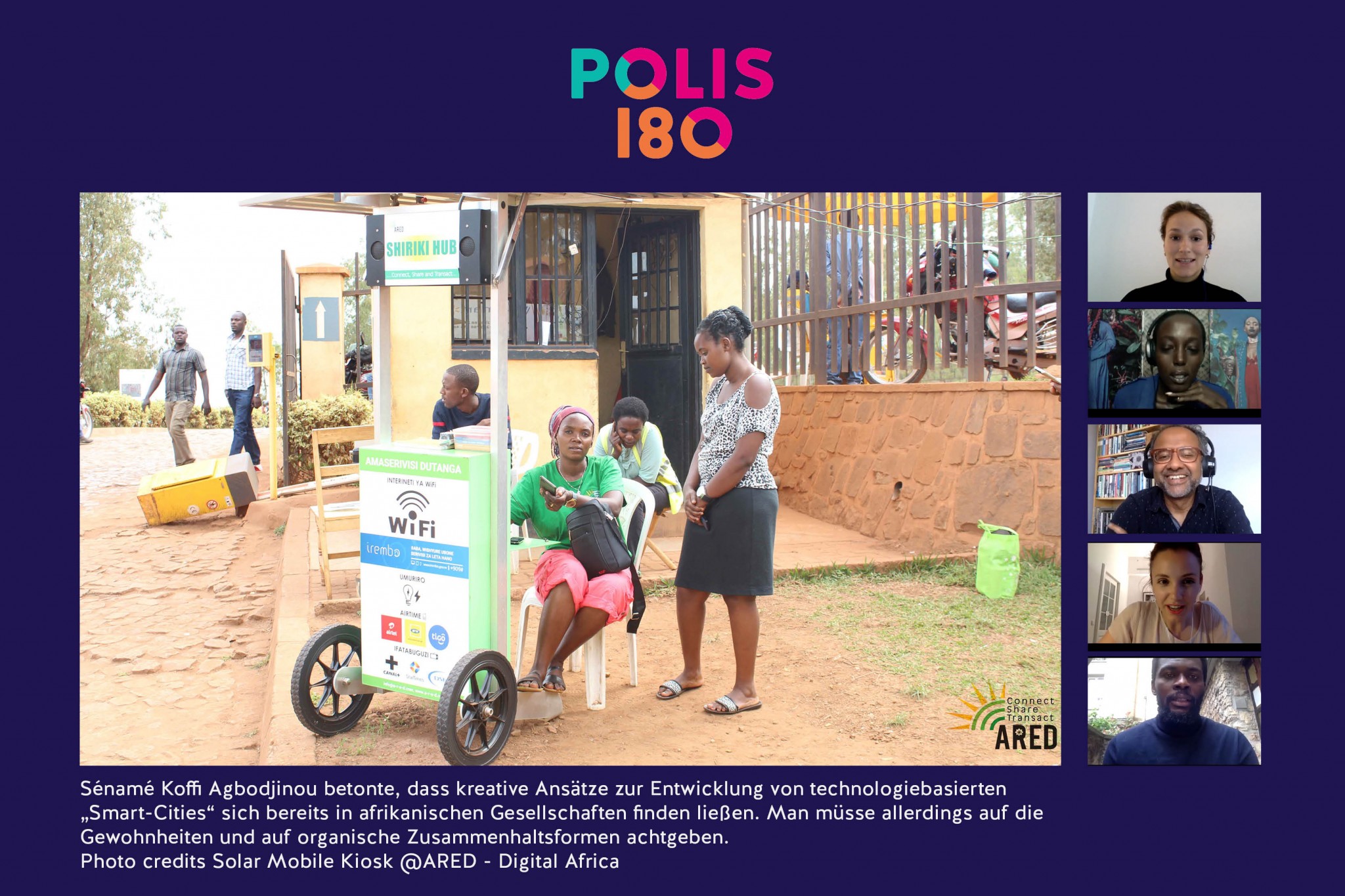 Er entwickelt das sogenannte #LowHighTech-Konzept, in dessen Innovationsansatz Personen aus sozial schwachen Strukturen einzubezogen werden. Seine Vision ist eine alternative ,African Smart City‘, in der Probleme wie Abfall durch die Verbindung von moderner Technologie und Tradition angegangen werden. In der Diskussion erklärte er, dass durch gezielte Ausbildungsprogramme technischer Fortschritt und wichtige kulturelle Traditionen des sozialen Zusammenhalts zusammengedacht würden, während die Plattform-Giganten aus dem Silicon Valley einer gesellschaftlichen Vereinzelung und Selbstentfremdung Vorschub leisteten.
