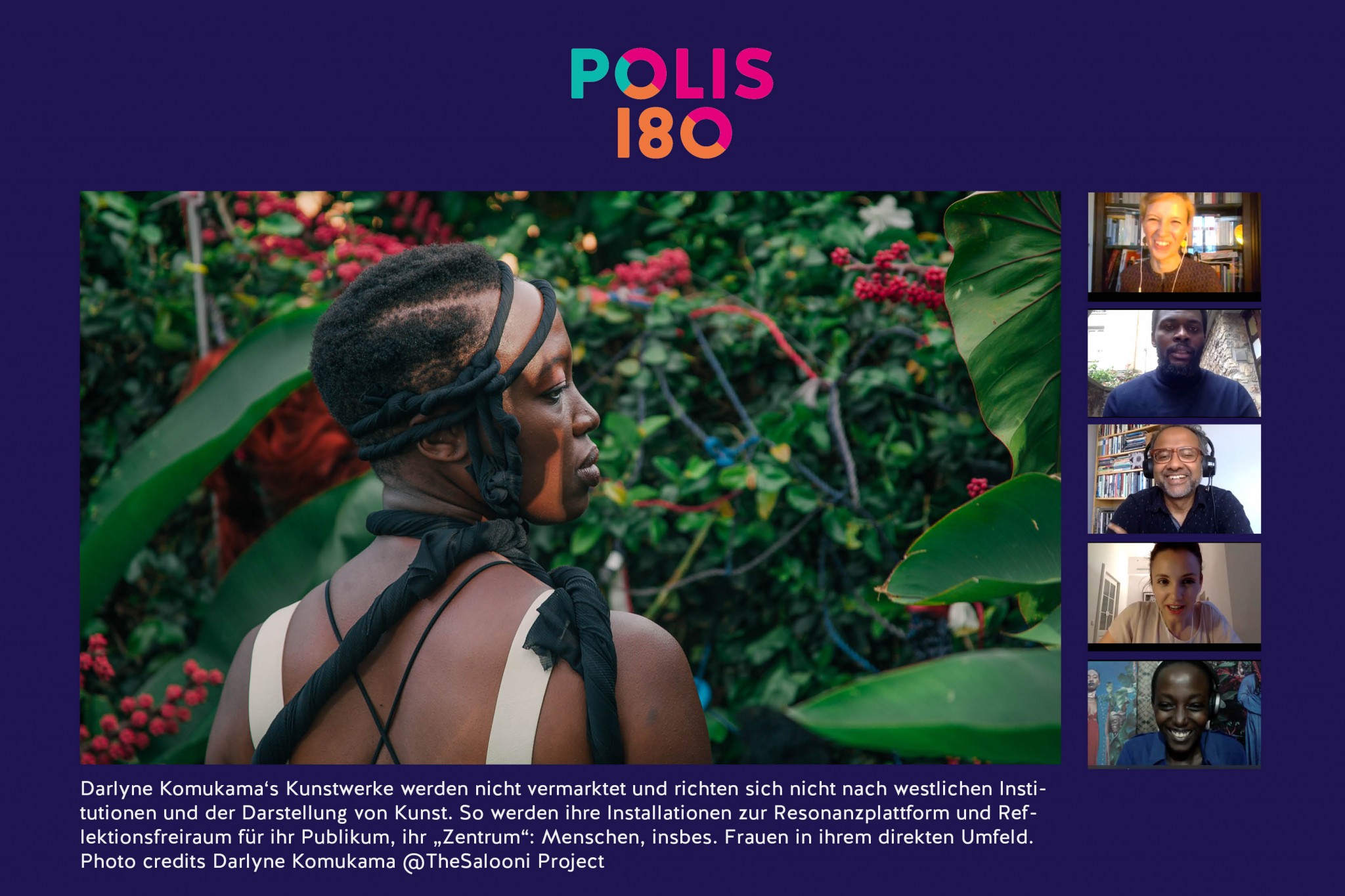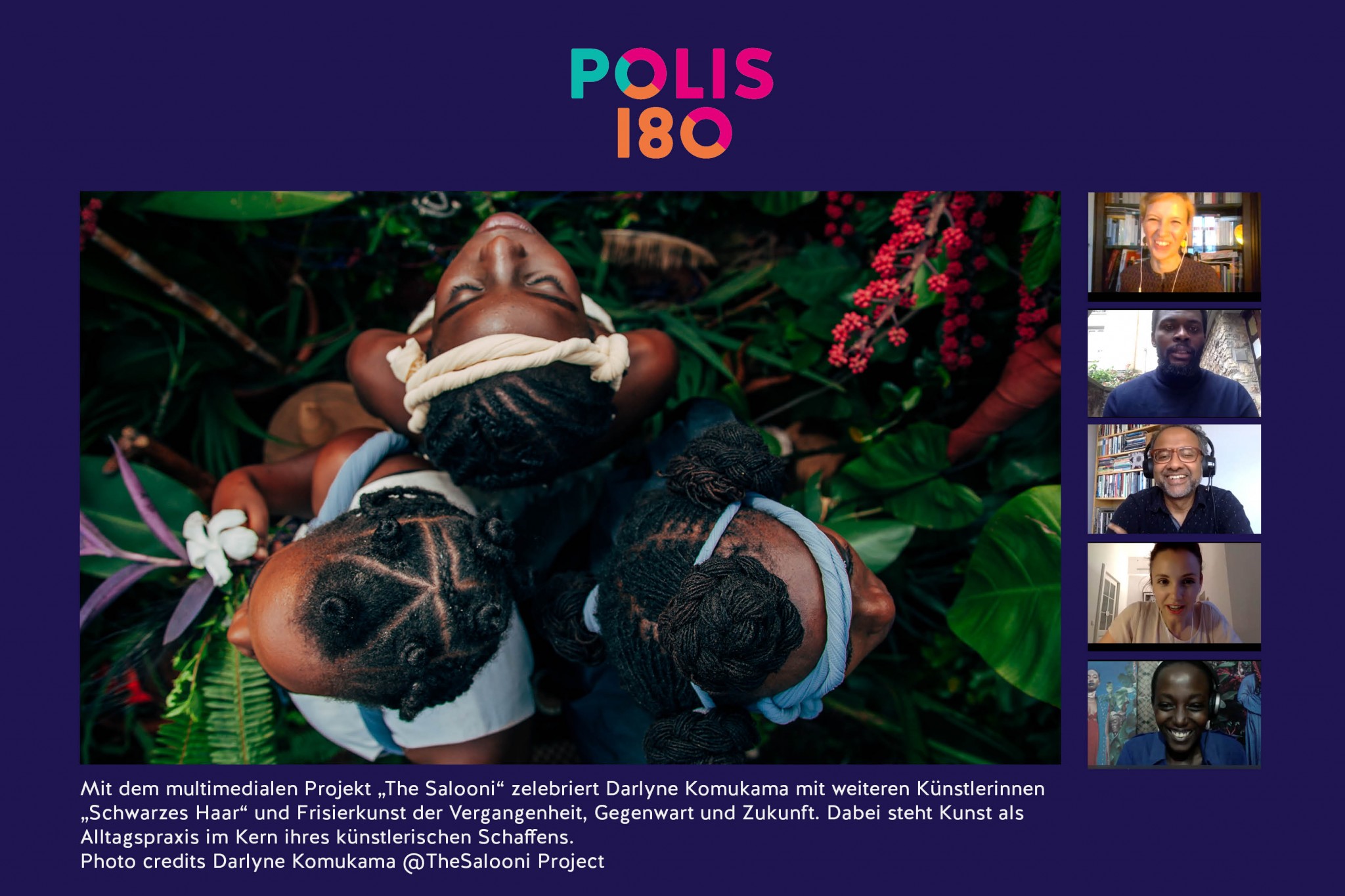 Die als Fotografin, Installationskünstlerin und DJ aktive Uganderin Darlyne Komukama ist mit ihrem künstlerischen Selbstverständnis tief in den kulturellen Praktiken ihres unmittelbaren Umfelds in Kampala verwurzelt. Sie arbeitet meist im Kollektiv, um ihre zentralen Themen zu untersuchen: „femininity, blackness and connectedness”. In ihrem Projekt „The Salooni“, einer multimedialen Wanderinstallation, erforscht und zelebriert sie zusammen mit drei weiteren ugandischen Frauen „Schwarzes Haar“, dessen traditionelle Frisiertechniken über Generationen hinweg als kulturelle Praxis weitergegeben wurden und das stark mit der Identität afrikanischstämmiger Menschen verbunden ist.