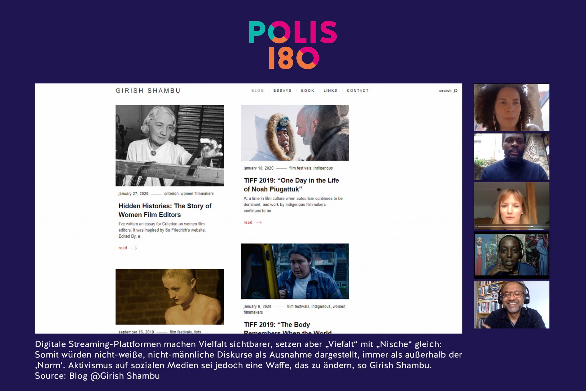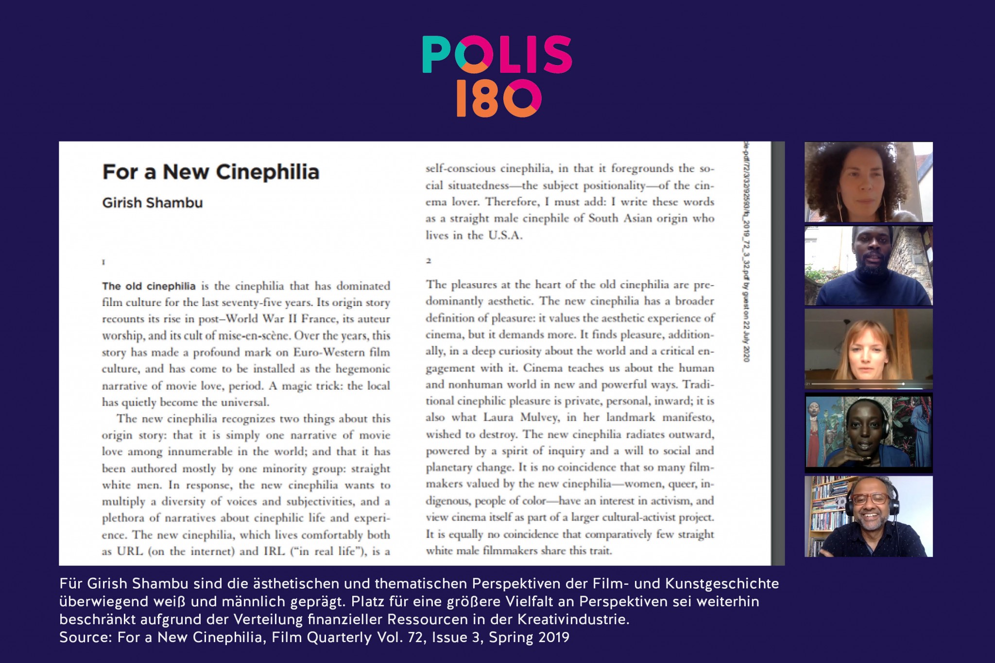 Der US-amerikanische Filmjournalist Girish Shambu betreibt seit 2004 seinen Film-Blog und veröffentlichte Texte im Film Quarterly, Framework, Film Comment und in der Criterion Collection. Kürzlich erschien sein Manifest „For a New Cinephilia“, in dem er schreibt, dass die bisherigen 75 Jahre Filmgeschichte nur eine eingeschränkte Perspektive widergespiegelt hätten, nämlich die einer Minderheitengruppe: eine Perspektive ,heterosexueller weißer Männer‘. Mit seiner „New Cinephilia“ fordert Girish Shambu eine Diversifizierung filmischer Narrative, die die Vielfalt unserer Gesellschaften tatsächlich reflektieren.