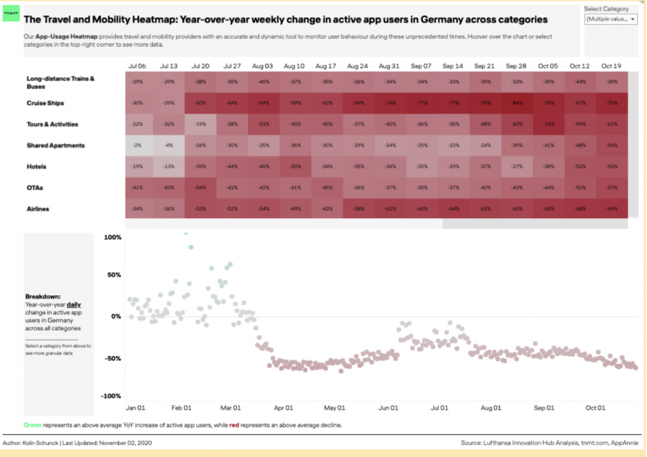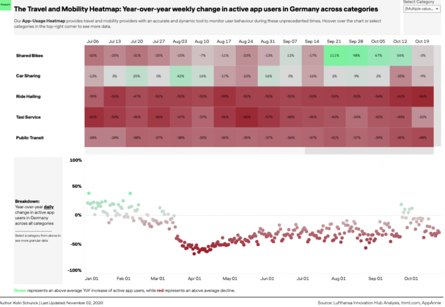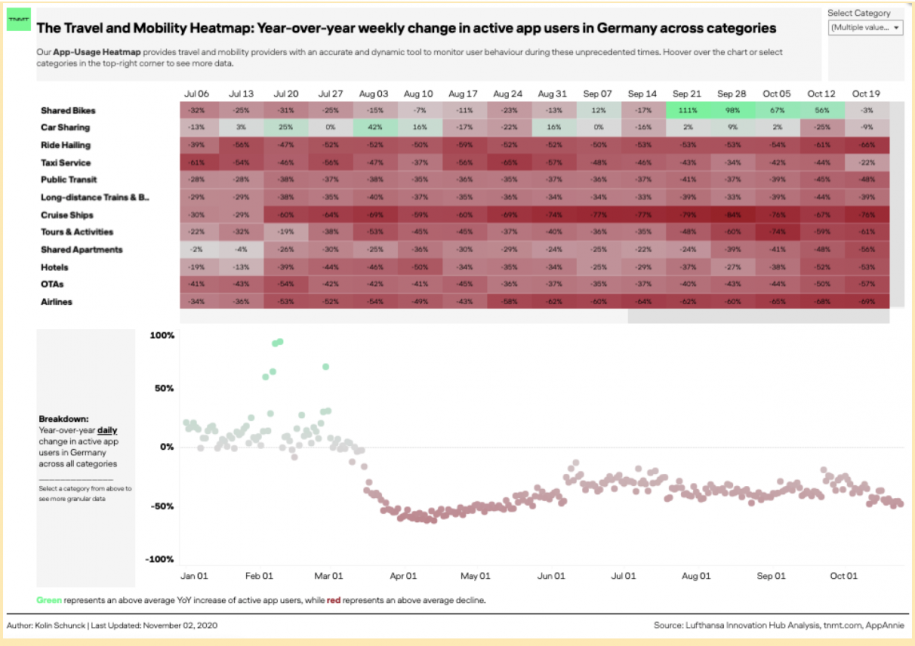 The coronavirus pandemic has slammed aviation, the wider travel and the mobility tech industry, unlike anything we have ever seen before. With people being locked into their homes for many weeks, mobility activity dropped to an unforseen low. A slow recovery mode has set in during the summer. Some mobility and travel sectors returned quicker than others, as the Travel and Mobility Category Heatmap for Germany by TNMT (measured using active app usage) shows.