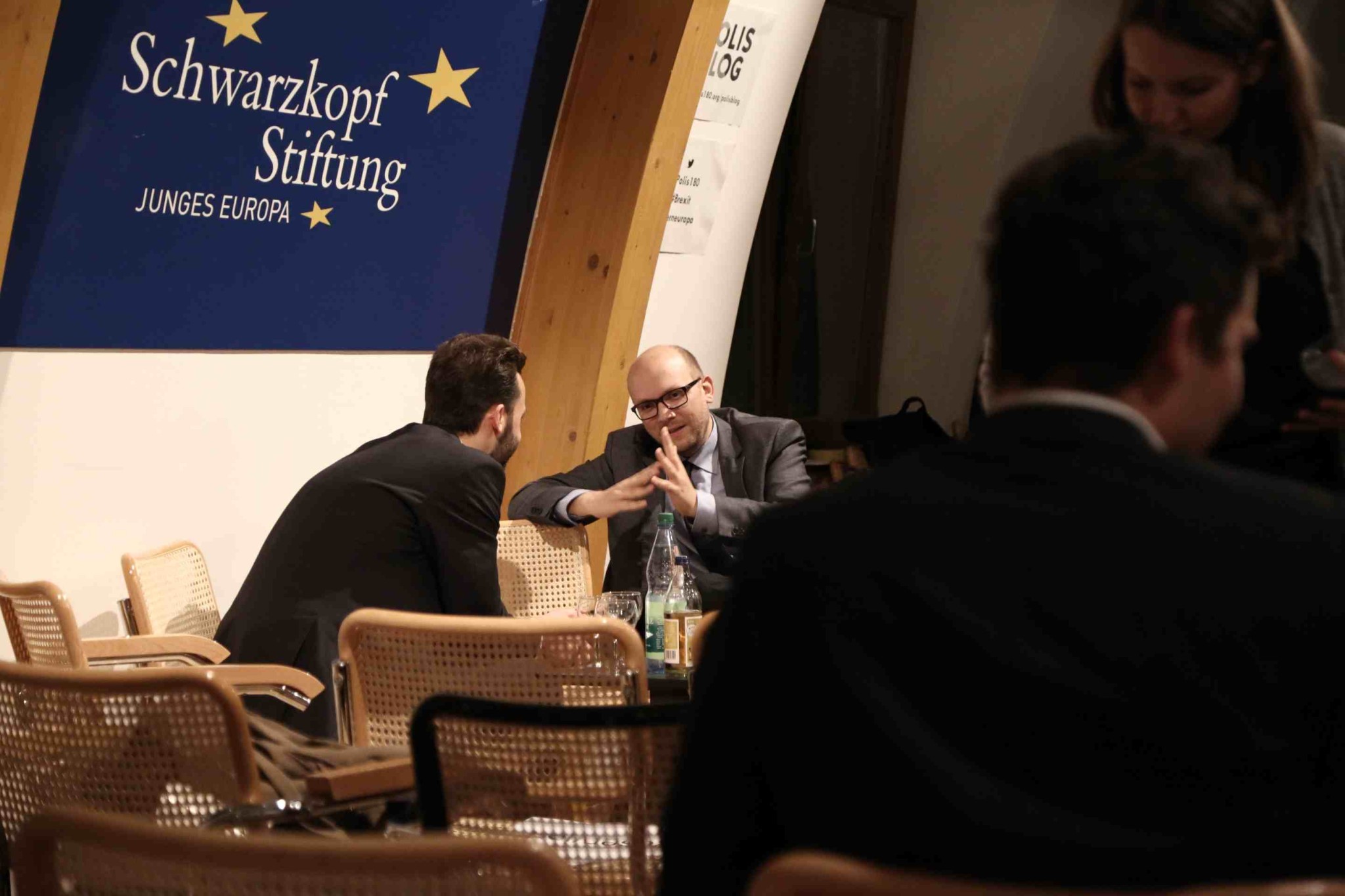 Nachdem der Leiter des EU-Programms, Julian Zuber, sowie der Organisator der Veranstaltung und Präsident von Polis180, Christian Freudlsperger, kurze einleitende Worte an die mehr als 60 Anwesenden gerichtet hatten, ging es zwischen den beiden Diskutanten sogleich ans Eingemachte. Dank Fishbowl-Format stets aufs Neue durch die Wortbeiträge des Publikums angeregt, debattierten sich die beiden Gäste packend und kontrovers durch sämtliche Spielarten des Kerneuropakonzepts – von der Rolle des deutsch-französischen „Motors“ über die Position von Nicht-Euro-Staaten in einem ebensolchen Arrangement bis hin zur Frage nach der Finalität des europäischen Projekts.