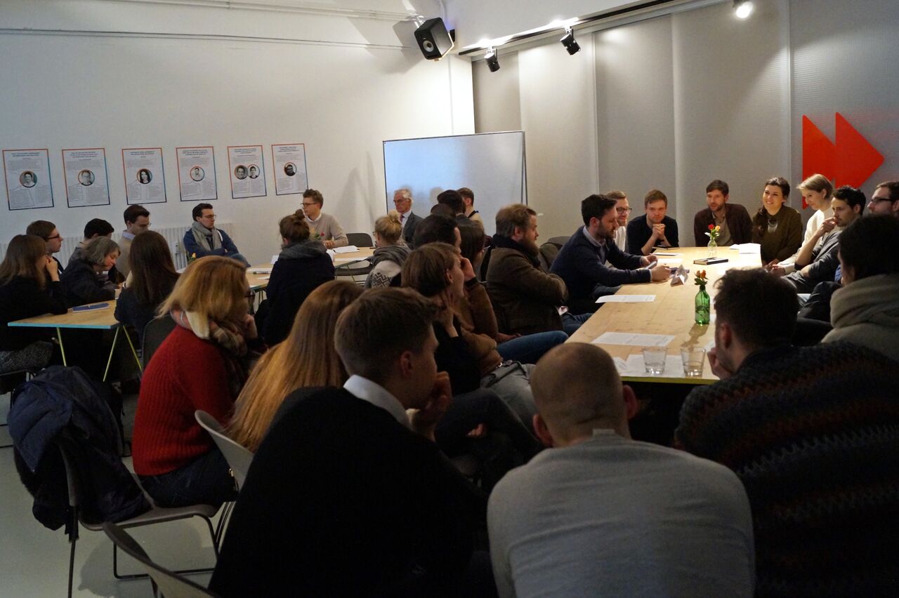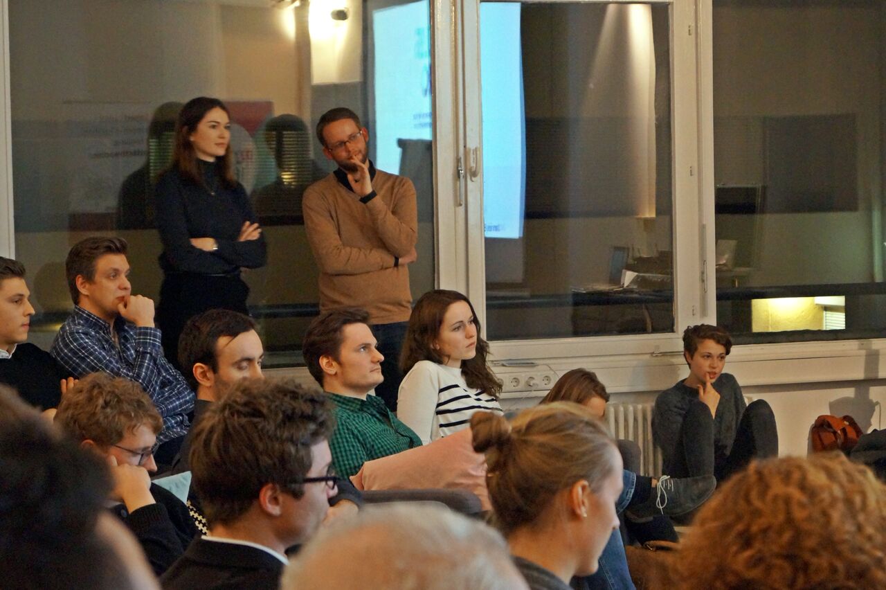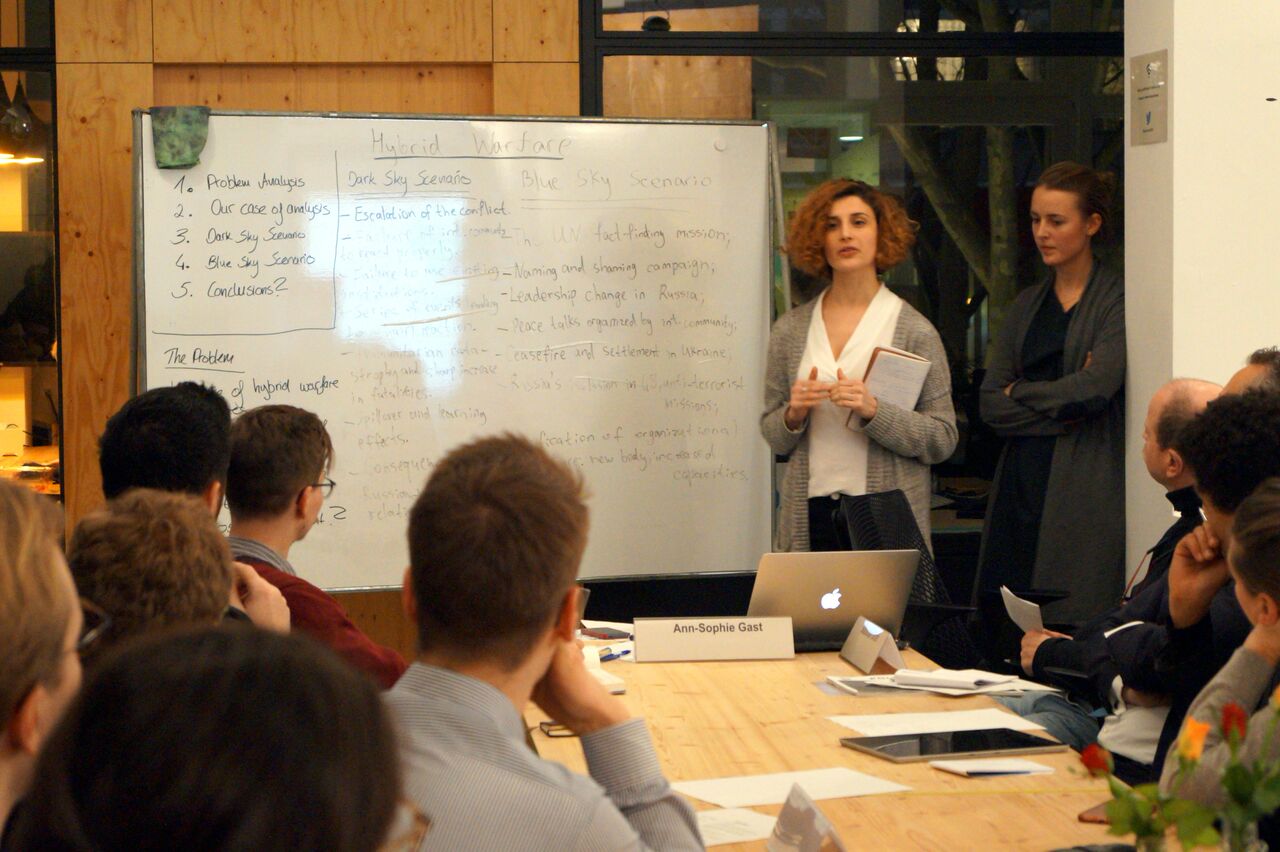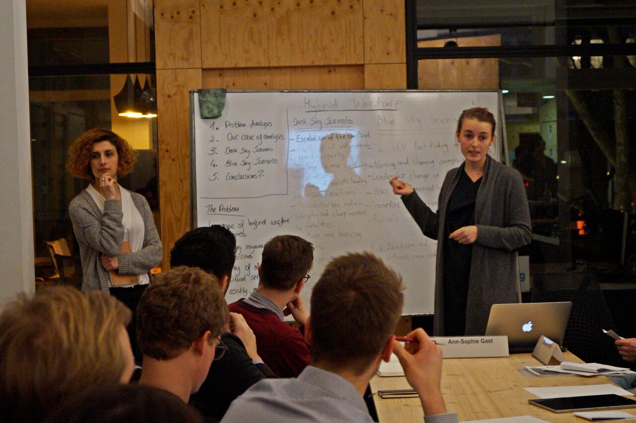 Die Editoren des Papers, Kevin Müller, Fanny Ries und Julian Schwartzkopff, eröffneten den Abend mit einem kurzen Überblick über den gewählten Ansatz und die sieben Szenarien. Sebastian Groth nahm dann in einem Kurzvortrag auf die Szenarien Bezug und berichtete aus der Arbeit des Planungsstabs. Es folgte ein detaillierterer Blick in drei ausgewählte Szenarien: Hybride Kriegsführung, antimikrobielle Resistenz und die zukünftige geopolitische Rolle der Arktis. Die über 80 Teilnehmer teilten sich in kleinere Gruppen auf und debattierten mit den Autoren über die Szenarien.