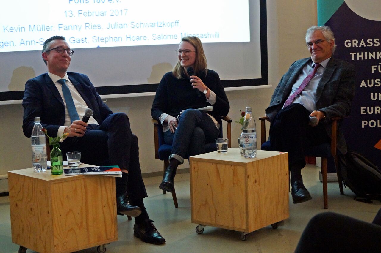 Schließlich begaben sich die eingeladenen Experten Sebastian Groth sowie Prof. Dr. Hanns Maull (Stiftung Wissenschaft und Politik) mit dem Publikum und der Moderatorin Kassandra Becker in eine Fishbowl-Diskussion.