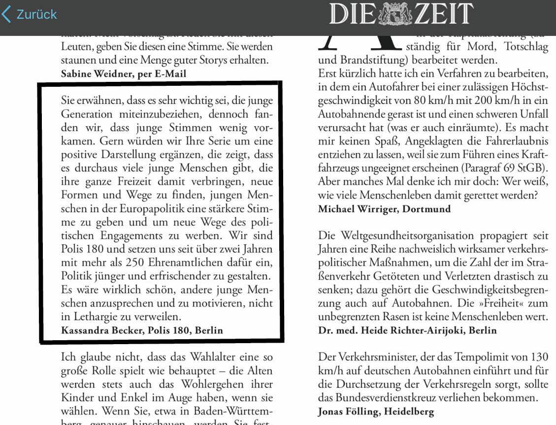 Marie Rosenkranz/ Kassandra Becker im Zeit-Leserbrief über junges Engagement und Polis180, Zeit, 26.08.2017