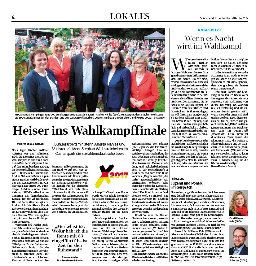 Landeszeitung für die Lüneburger Heide zu “Demokratie braucht Dich” in Lüneburg, 02.09.2017, “Jugend und Politik im Gespräch”