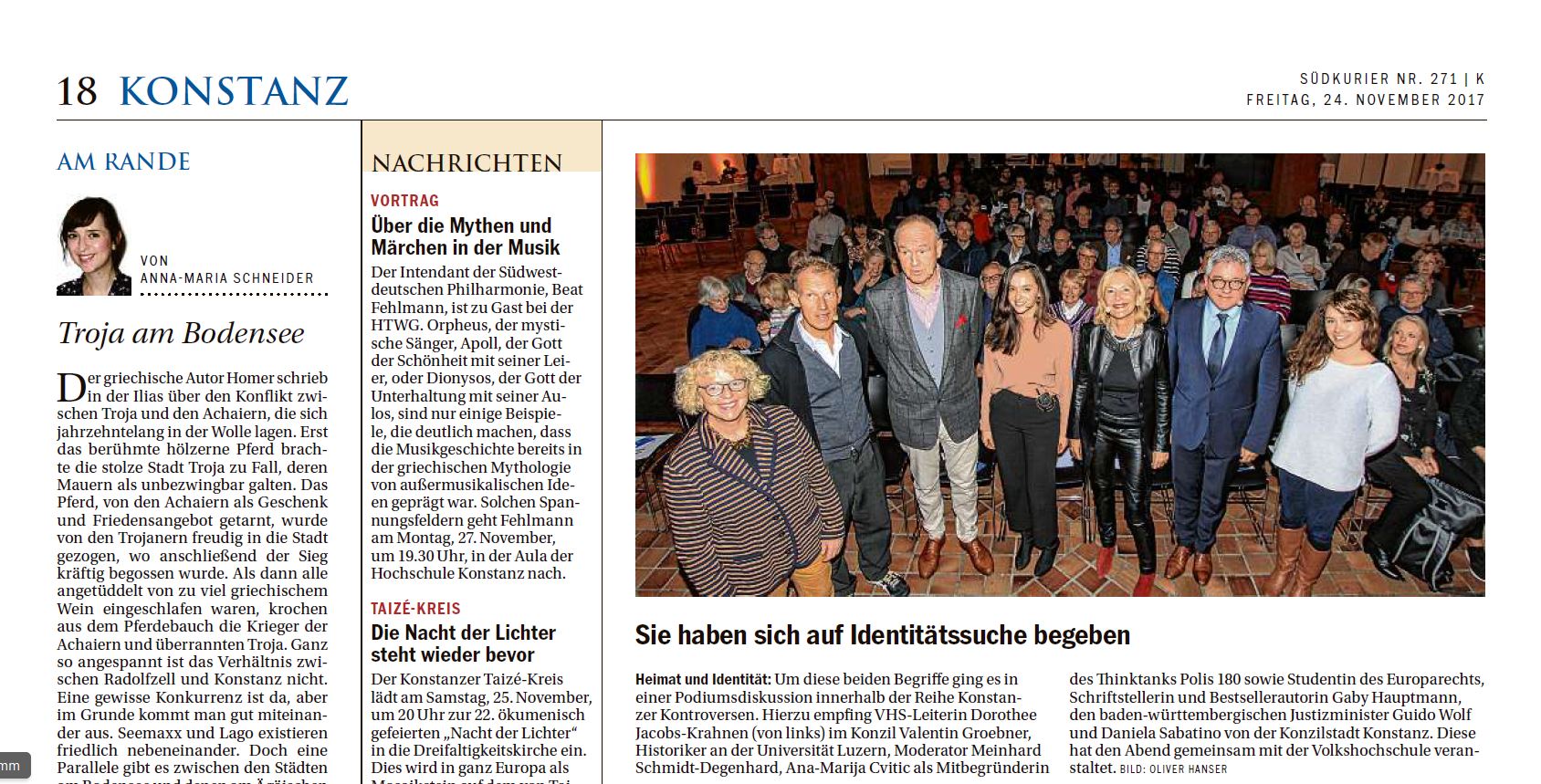 Südkurier zur Podiumsdiskussionsreihe “Konstanzer Kontroversen” mit Ana-Marija Cvitic. “Sie haben sich auf Identitätssuche begeben”, SK, 24.11.2017